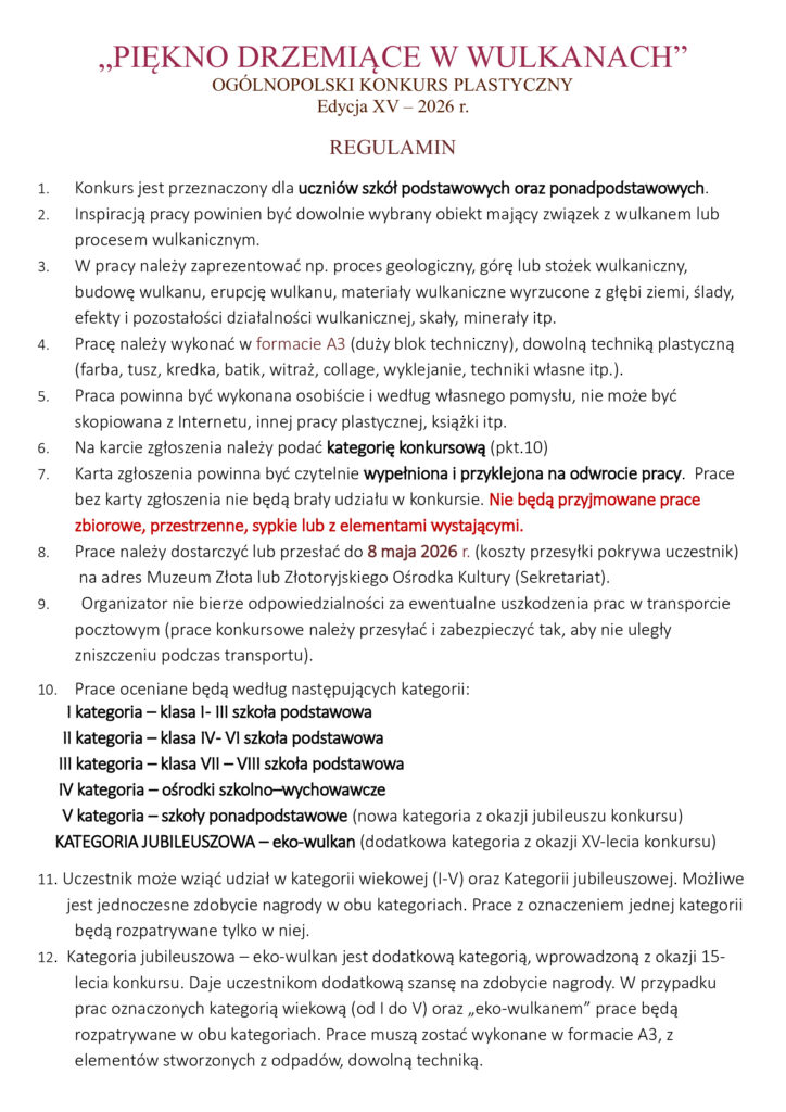 Zapraszamy dzieci i młodzież ze szkół podstawowych oraz ponadpodstawowych do udziału w XV edycji Ogólnopolskiego Konkursu Plastycznego „Piękno drzemiące w wulkanach”. W pracy należy zaprezentować np. proces geologiczny, górę lub stożek wulkaniczny, budowę wulkanu, erupcję wulkanu, materiały wulkaniczne wyrzucone z głębi ziemi, ślady, efekty i pozostałości działalności wulkanicznej, skały, minerały itp.